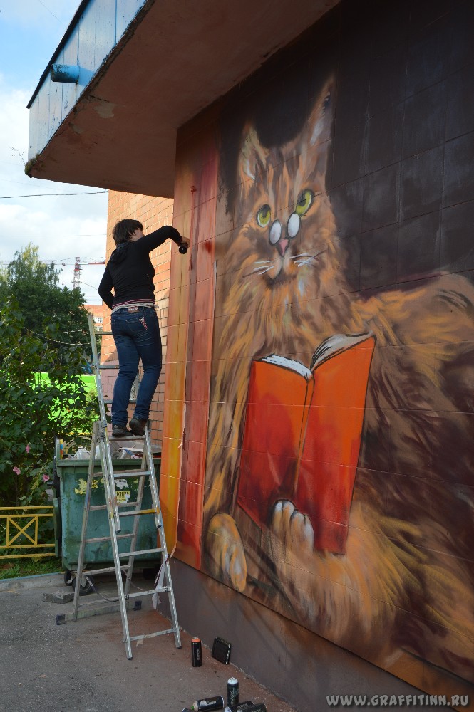 «На выбор нам было предложено несколько адресов, но когда я увидела входы в библиотеку и их необычную форму, сразу поняла, что это отличная площадка для творчества! Тем интереснее, что нужно было преобразить сразу 5 стен – это уже не отдельная картинка, а мини проект.» — говорит АНКа, автор нового имиджа библиотеки. – «Подъезды сами по себе напоминали полки, осталось только добавить им немного цвета и поставить на них книжки. Тематика рисунков выбрана не случайно: каждый из них отражает то, что в действительности находится за стеной. За Нижегородским кремлем – отдел исторического